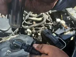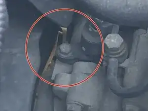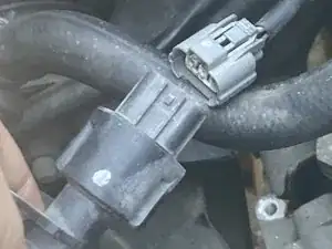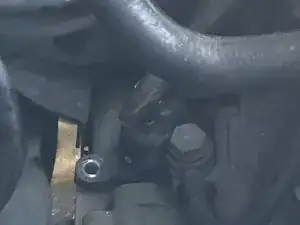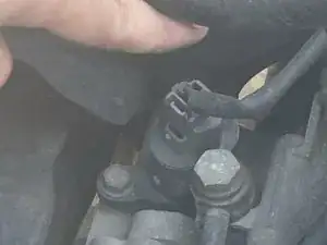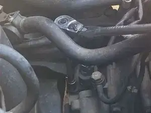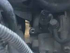 Поднимите трубки двигателя в сторону, чтобы увидеть датчик зубчатого колеса спидометра с 12,0-мм фланцевым болтом и разъемом, расположенными рядом друг с другом.