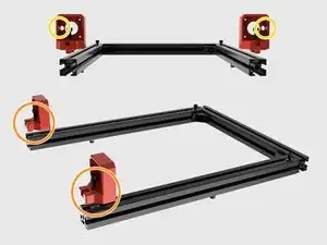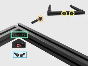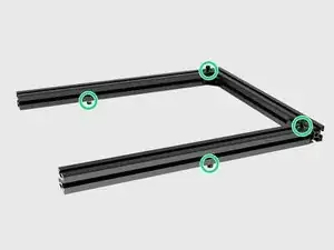Выровняйте алюминиевые профили, как показано на фотографии. 2 x винта с цилиндрической головкой M8 для верхних углов X-рамы. Пока не затягивайте их полностью. Только удерживайте форму рамы. (Не забудьте вставить T-гайки перед затягиванием M8)