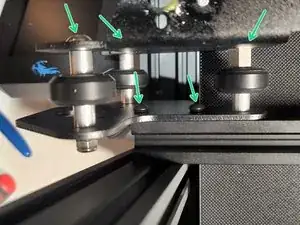 Чтобы снять Y-каретку, ослабьте 2 эксцентриковые гайки правой стороны 10 мм ключом и выдвиньте всю Y-каретку из профиля 4040.