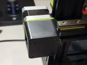 Прикрепите крепление шагового двигателя X к профилю X 2020 с помощью 2× M4×16 винтов с полукруглой головкой и M4 пружинной шайбы в исходные наружные монтажные отверстия. Убедитесь, что оно заподлицо и ровно.