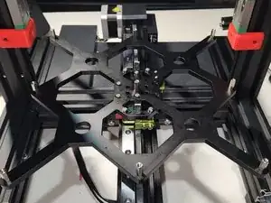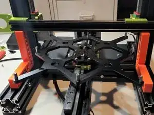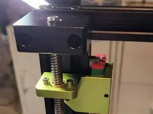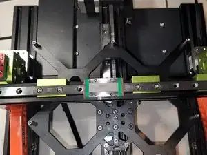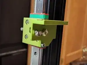 Прикрутите POM-гайку подающей винтовой пары к креплениям по оси X с помощью 4× M3×14 винтов с цилиндрической головкой или винтов с полукруглой головкой, 8× M3 шайб, 4× M3 пружинных шайб и 4× M3 стопорных гаек. Не затягивайте их окончательно. Потребуются мелкие регулировки, поэтому должно быть возможно сдвигать их вперёд-назад.