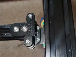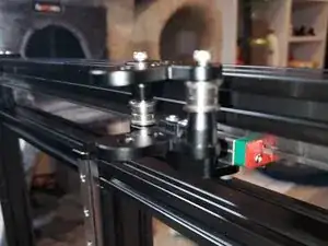 Вставьте 2x винта M3x30 с полукруглой головкой в верхнее правое крепление X 2020, затем наденьте на винты по 2 сборки подшипников.
