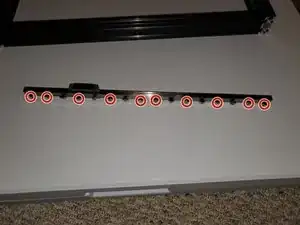 Используя 2 шаблона для линейной рельсы 2020 начните с одного конца рельсы и двигайтесь слева направо, затягивая винты M3x8 до плотного состояния.