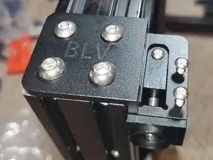 Закрепите узел на верхней левой части рамы с помощью 2x винтов с кнопочной головкой M5x8, 2x T-образных гаек M5 и 2x винтов с кнопочной головкой M6x10. Как только пластина станет ровной, затяните винты.