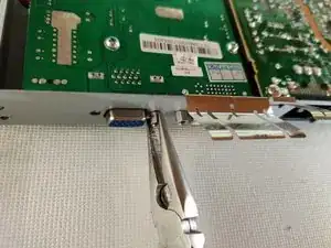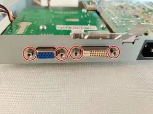 Используйте торцевой ключ 5 мм, чтобы открутить 4 шестигранных винта, которыми разъёмы VGA и DVI крепятся к кожуху.