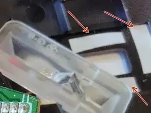Во время этих двух шагов следите за тем, чтобы оптический блок оставался на месте относительно чёрного элемента на плате. Если все части установлены правильно, оптический блок должен приклеиться к чёрной крышке с помощью двусторонней ленты. Можно помочь, аккуратно прижав прозрачный блок к чёрной крышке.