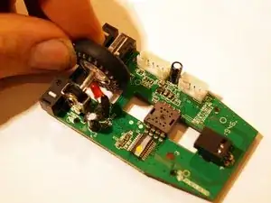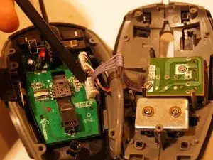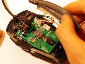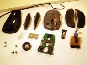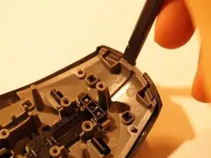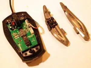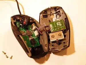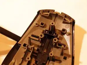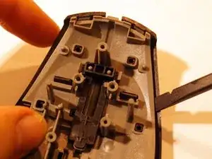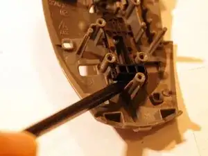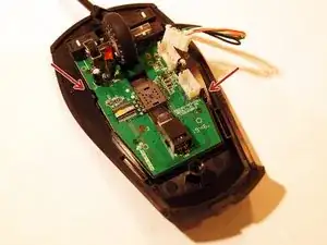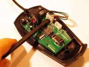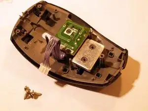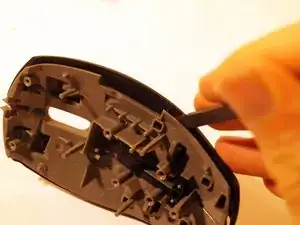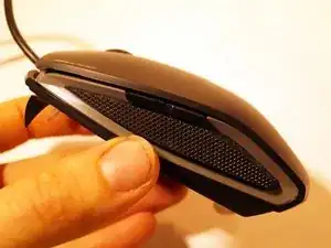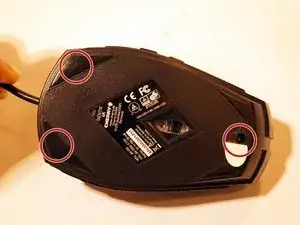 Снимите две верхние ножки мыши. Достаточно удалить половину ножки, чтобы добраться до винтов.