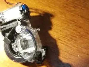 Я разбрал сборку в попытке вынуть колесо — безуспешно. Не знаю, куда идёт эта странной формы пружинка, возможно на этот штифт, но я оставил её и, похоже, она не важна.