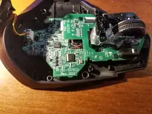 Сборка колеса прокрутки закреплена двумя винтами P0 спереди. Под ленточным кабелем платы, которую вы только что сняли, спрятан разъём для мотора.