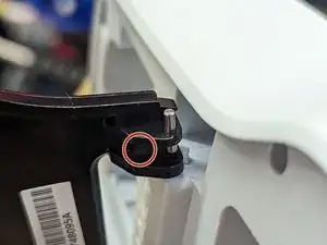 Петля дверцы — это небольшой пластиковый выступ в корпусе, который входит в большое отверстие на дверце (см. красный круг); небольшого рычага с лопаткой достаточно, чтобы освободить его.