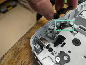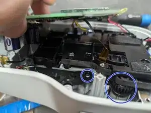 Теперь аккуратно поднимите раму и плату. На фото видно синее окруженное колесо; это пример компонента, который поддерживается рамой, которую мы снимаем. Отметьте вещи, которые могут выскочить, например пружинную скобу.