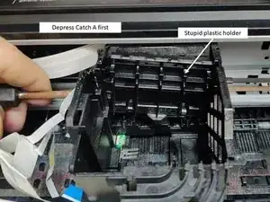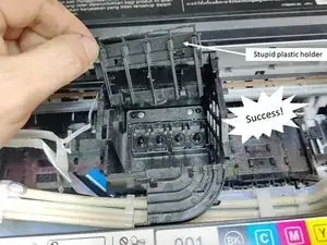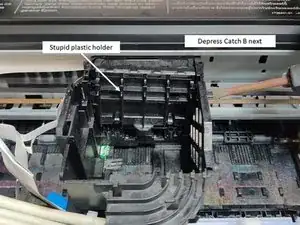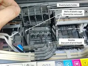 - Только разобрав конструкцию до конца, я решил создать руководство. В вашей ситуации вы обнаружите, что все кабели подключены (и их придётся сдвигать). НЕ вытягивайте кабели до тех пор, пока не доберётесь до печатающей головки!