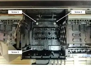 После снятия пластикового держателя вы увидите, что печатающая головка закреплена тремя винтами (фото 1).