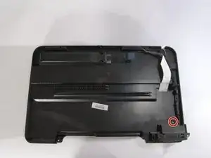 Опустите обе передние панели, чтобы открыть принтер. Поднимите крышку сканера вверх, потянув её вниз; имеются две защёлки, которые нужно оттянуть вниз.