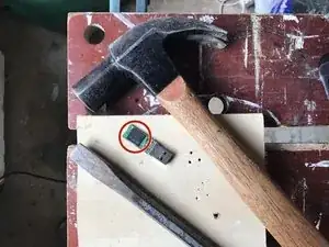 Уложите устройство на твёрдую поверхность, приложите кончик холодной стамески по центру чипа памяти и энергично ударьте по стамеске молотком.