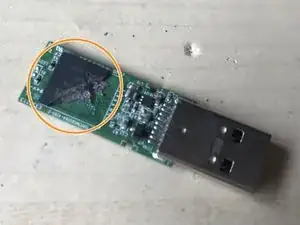 Просверлите чип памяти. Поскольку кремний твёрдый и хрупкий, чип может треснуть, а не поддаться сверлу. Тем не менее, задача выполнена!