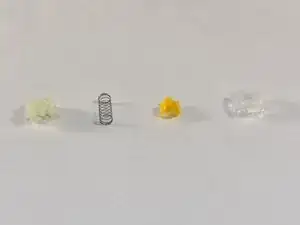 Определите различные компоненты переключателя и порядок их сборки (слева направо или снизу вверх): нижний корпус, пружина, стержень, верхний корпус. Отделите их от переключателя.