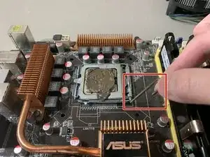 Поднимите металлический зажим, чтобы извлечь сам процессор. Для этого шага есть металлическая защёлка, которую можно слегка надавить, чтобы аккуратно отвести зажим после ослабления защёлки.