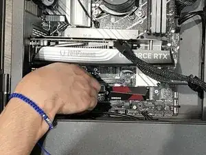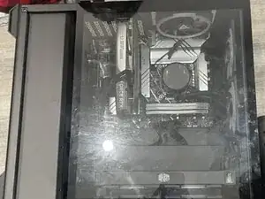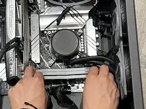 Перед началом ремонта полностью выключите ПК и отключите все периферийные устройства. Нажмите и удерживайте кнопку питания ещё 15 секунд, чтобы разрядить остаточное электричество. Затем положите корпус ПК на бок и снимите стеклянную панель, чтобы начать ремонт.