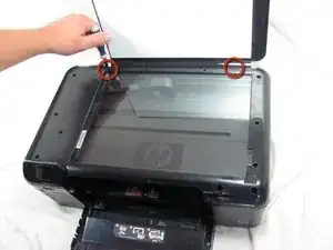 Отверткой T10 отвинтите два винта, которыми рамка прикреплена к крышке принтера.