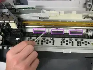 Примечание: Если вы хотите очистить дополнительные детали внутри принтера, следуйте инструкции по снятию верхней крышки. Это даст доступ к большему количеству деталей. После снятия верхней крышки выполните следующие шаги.