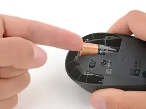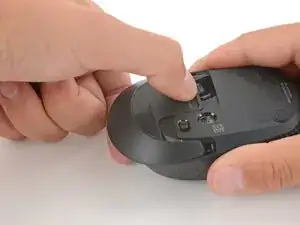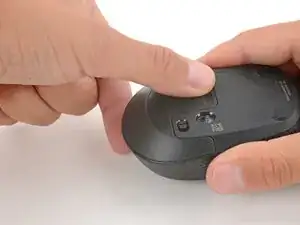 Нажмите на крышку отсека батареи и сдвиньте её в сторону от мыши, чтобы снять.