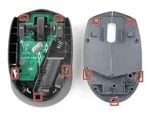 Верхняя половина мыши удерживается пластиковыми защёлками. Их освобождение — сложная задача. Обратите внимание на следующее перед тем, как приступить: