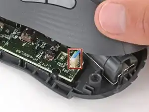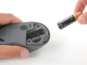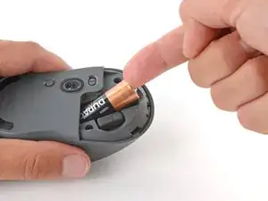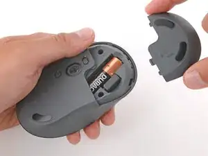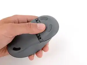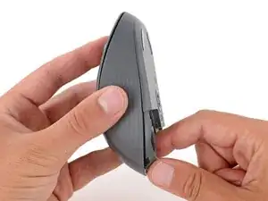 Нажмите на крышку батареи большим пальцем и сдвиньте её от мыши, чтобы отсоединить.