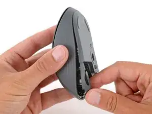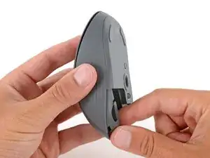 Нажмите на крышку батареи большим пальцем и сдвиньте её от мыши, чтобы отсоединить.
