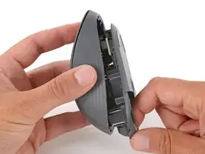 Нажмите на крышку батареи большим пальцем и сдвиньте ее от мыши, чтобы отсоединить.
