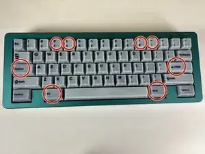 Используйте съемник колпачков, чтобы снять колпачки клавиш "3", "4", "0'", "-", "Caps Lock", "enter" и оба "alt" для доступа к винтам.