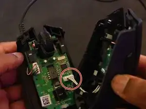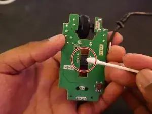 После удаления материнской платы оптический датчик будет полностью открыт. Это та деталь, которая вызывает задержку в работе мыши.