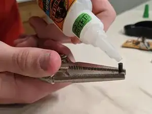 Удерживая ось с помощью небольших плоскогубцев, нанесите небольшое количество клея на сломанный конец оси.