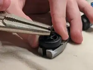 Зажмите колесо прокрутки в губках обычных плоскогубцев так, чтобы сломанная сторона была направлена вверх.