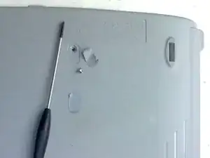 Сначала переверните сканер и снимите 3 винта на задней панели, которые закрыты тёмно-серыми овальными накладками (2 по краям, 1 в центре; две накладки между ними можно не трогать). Это делается для того, чтобы вам не приходилось переворачивать сканер позже, когда детали могут выпасть. Эти винты фиксируют металлическую «спину».