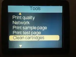 Производитель сначала предлагает использовать встроенную команду меню для очистки картриджей. Я получаю доступ к этому из меню на принтере, выбрав Меню/Инструменты/Очистить картриджи. Затем я нажимаю кнопку ОК на принтере.