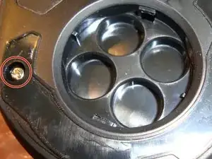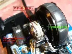 Побрызгайте очистителем электрических контактов прямо в указанное на картинке место в течение нескольких секунд, перемещая колесо прокрутки туда-сюда во время распыления.