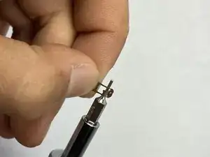 Вставьте тонкую плоскую отвёртку (1,0 мм) под арочную часть металла и осторожно подлкните, как будто пытаетесь приоткрыть арочную "дверцу".