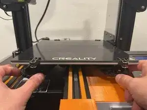Отвинтите регулирующие колёса под столом и снимите стол печати с его кронштейнов.