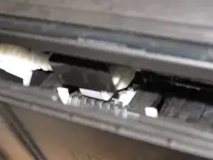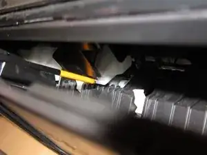 Найдите ролик подачи бумаги. Он должен располагаться в этой позиции (за чёрным пластиковым кожухом). Если он находится не на месте, значит, заедает. Аккуратно нажмите на него указательным пальцем вверх или осторожно используйте обратную сторону кисточки. Эти детали хрупкие.