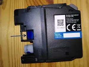 Возможно, датчик уровня чернил определяет картридж как пустой, хотя в нём ещё есть чернила. Чтобы продолжить печать в таком случае, просто заклейте одну сторону прозрачного окна непрозрачной лентой. (Переднюю часть картриджа можно снять и снова прикрепить по прорези для упрощения фиксации.)