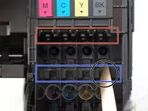 С лотком картриджей связаны несколько датчиков. Для каждого картриджа существуют следующие датчики: датчик обнаружения картриджа (отмечен красным), датчик остатка чернил (датчик уровня чернил, отмечен синим) и контакты микросхемы (отмечены зелёным, для считывания чипа картриджа).