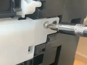 Удалите два винта, удерживающие крышку транспортного узла, с помощью отвертки Philips #1.