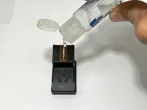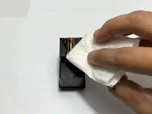 Положите картридж на чистую поверхность и нанесите несколько капель санитайзера для рук на спиртовой основе на сопло для чернил.