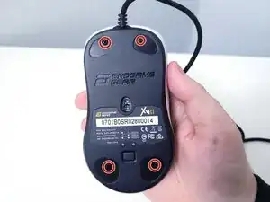 С помощью пластиковой лопатки оторвите четыре резиновые ножки на нижней стороне мыши.