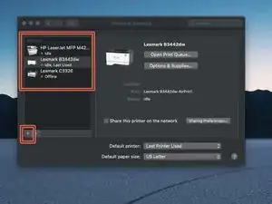 Нажмите +. Это позволит добавить принтер на Mac.