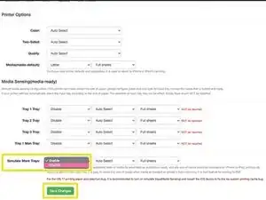 Нажмите на Параметры и выберите Имитировать дополнительные лотки. Если принтер выдаёт ошибку при включённой опции, измените её на Отключено. Нажмите Сохранить изменения, чтобы сохранить настройки.
