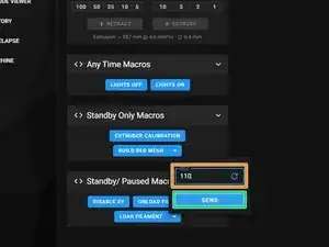Чтобы начать макрос, выберите стрелку раскрывающегося меню и введите температуру стола (оранжевую), которая соответствует параметрам вашего резака. Для Super Slicer это в профиле филамента. Нажмите Отправить (зеленая)