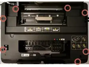 Открутите 7 торкс-винтов. Не забудьте про тот, что под наклейкой принтера (Эту наклейку нужно удалить. Нижний правый угол).