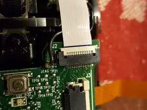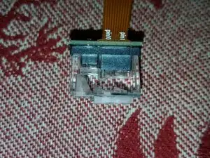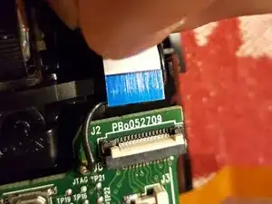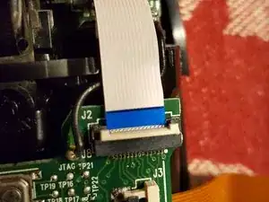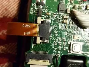 Отсоедините оранжевый ленточный кабель, аккуратно вытащив белую фиксирующую планку горизонтально из разъёма. После этого ленточный кабель легко выйдет из разблокированного разъёма.